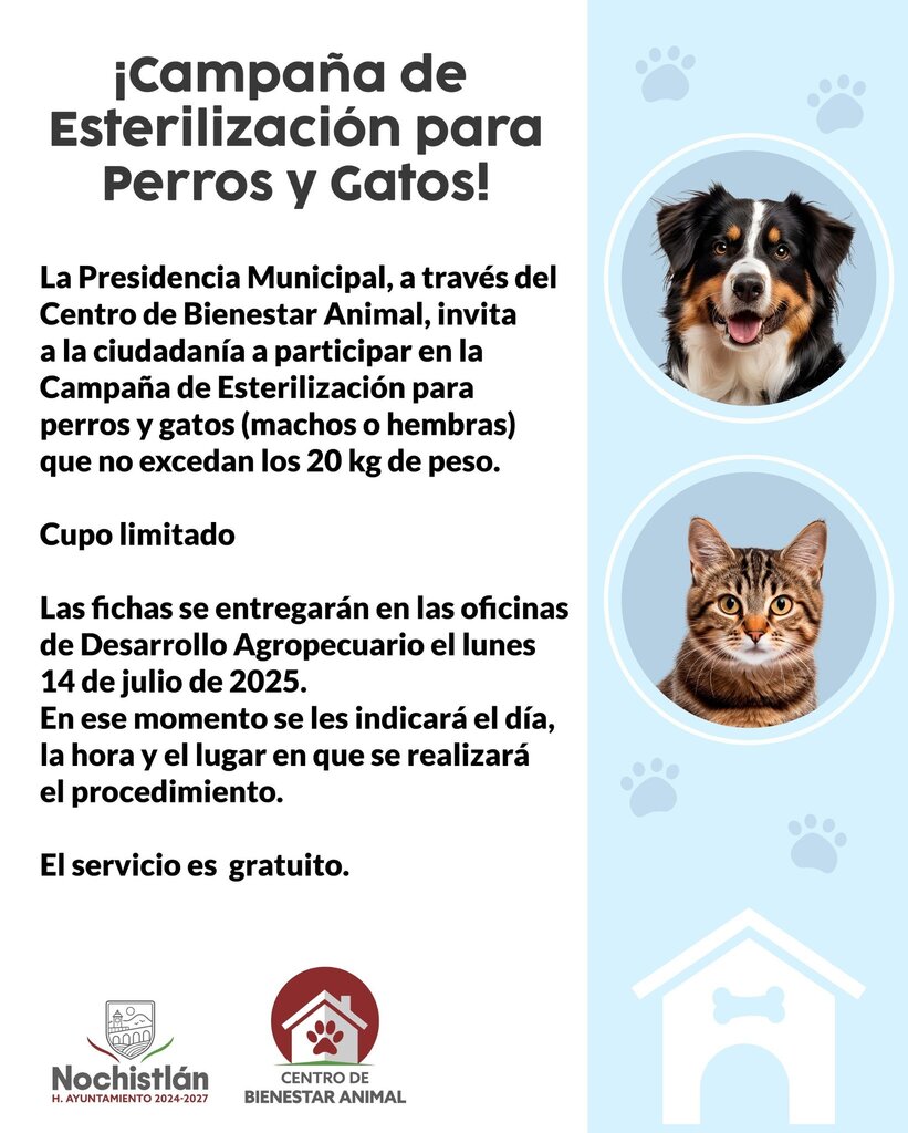 Campaña de esterilización para perros y gatos(machos o hembras) que no excedan los 20 kg de peso.