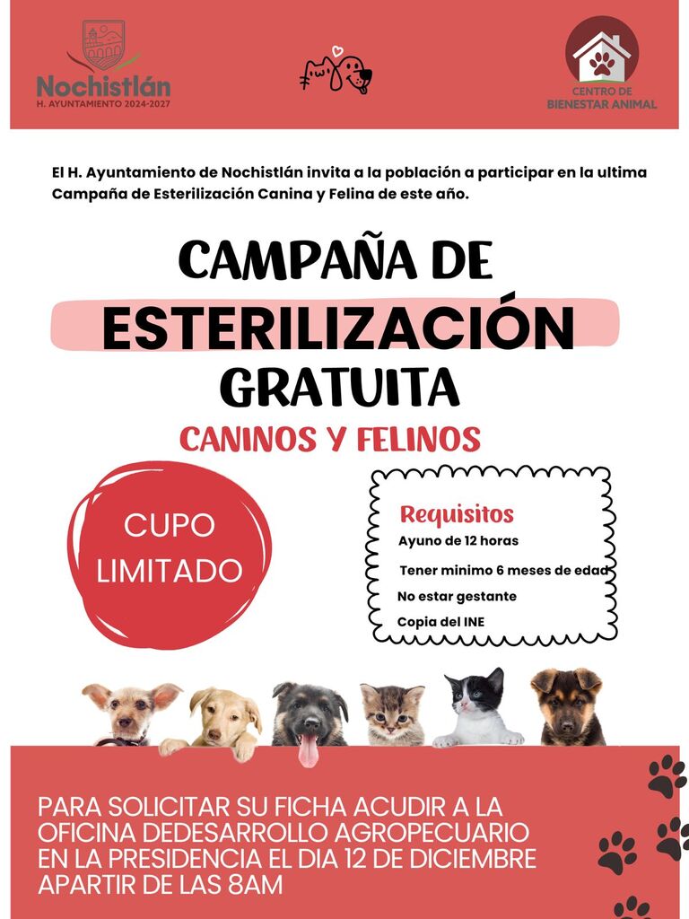 Invita a participar en la Campaña de Esterilización para perros y gatos (machos o hembras) con mínimo 6 meses de edad.