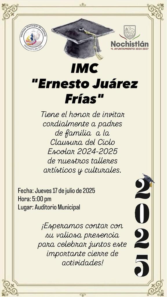 El Instituto Municipal de Cultura tiene el honor de invitarte a la Clausura de los Talleres Artísticos y Culturales del ciclo 2024-2025.
