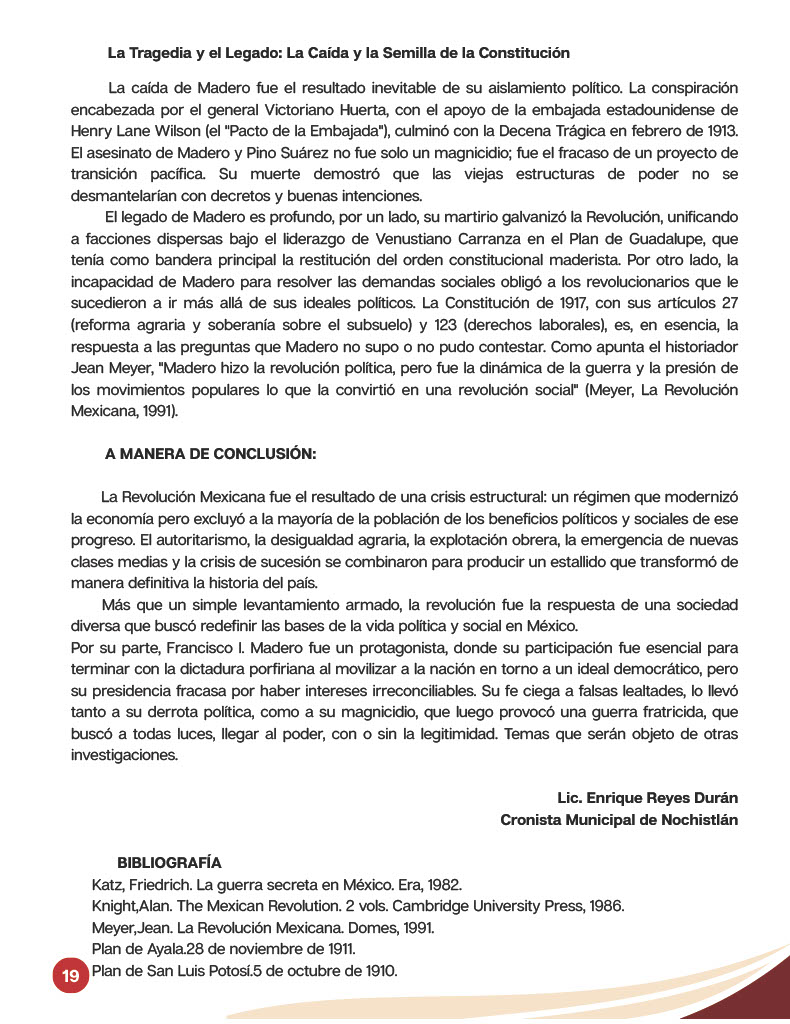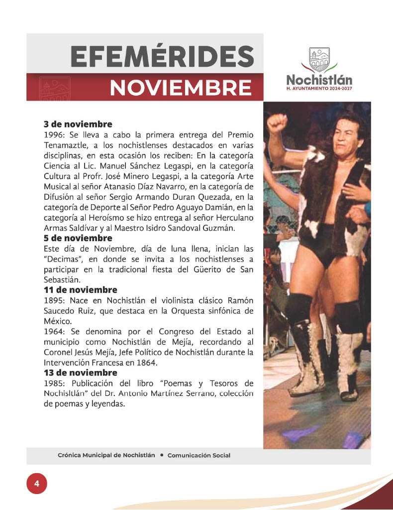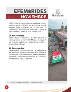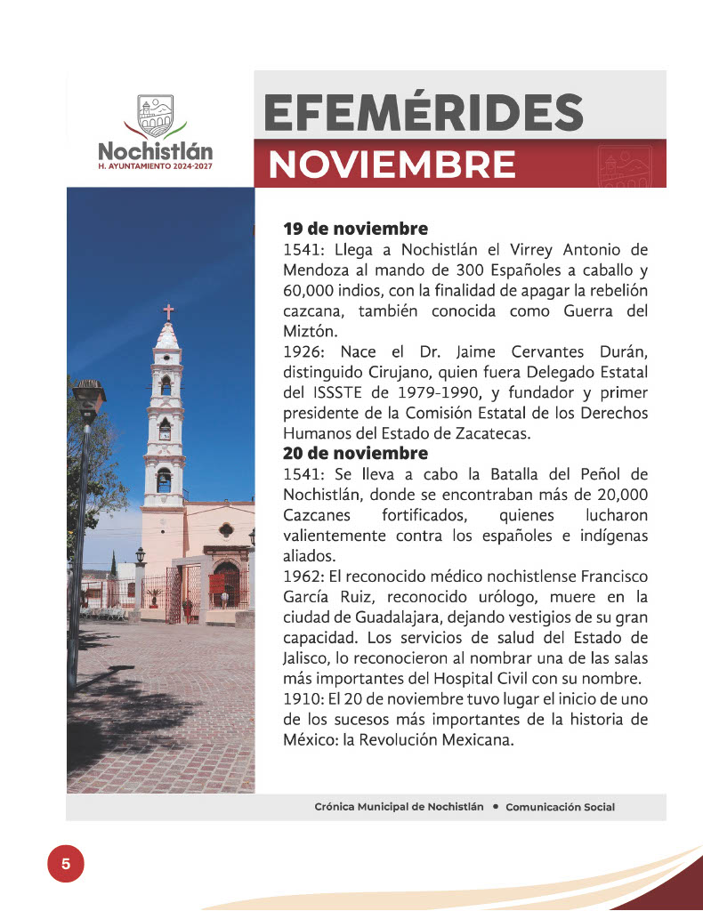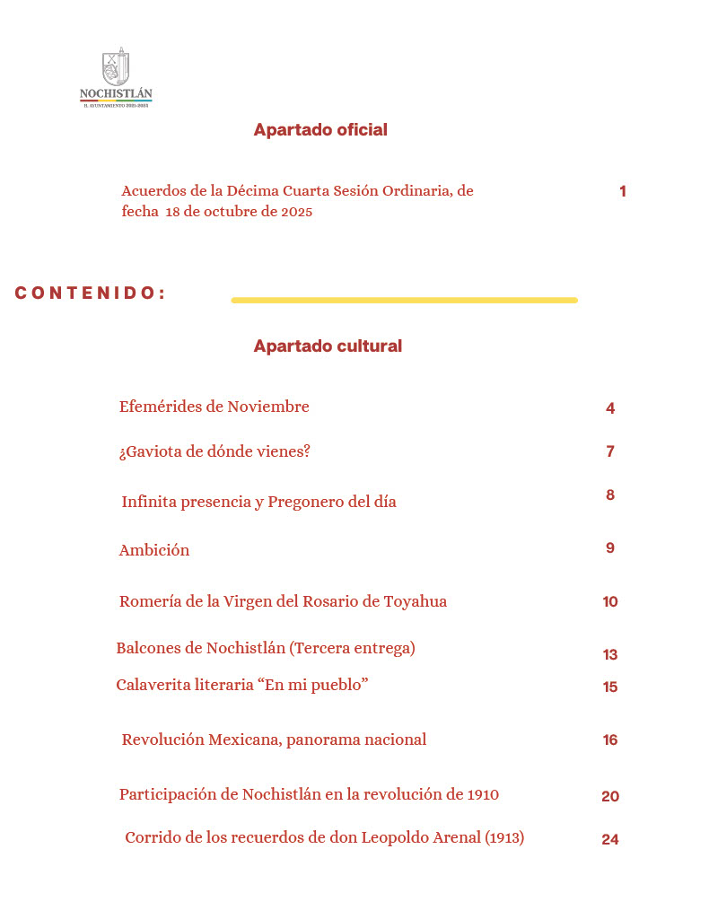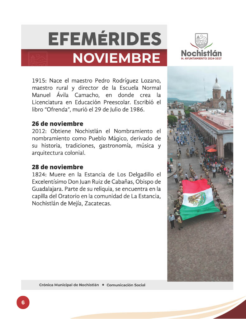 Además, en esta edición podrás encontrar temas de interés escritos por autores nochistlenses, así como contenido de la Crónica Municipal de Nochistlán, que enriquecen y preservan nuestra identidad y memoria histórica.
