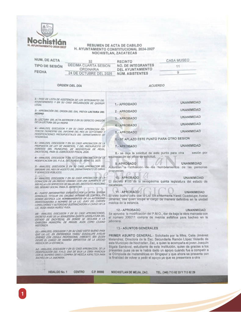 Consulta la información más relevante sobre los acuerdos, actividades y acciones realizadas por el H. Ayuntamiento de Nochistlán 2024–2027 durante este mes.
